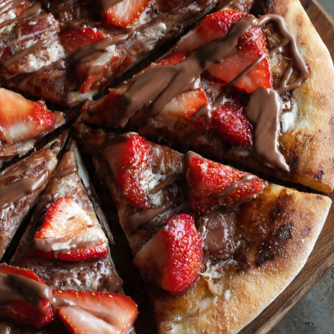 Nuestro postre ,masa de pizza ,crema de avellanas y fresas