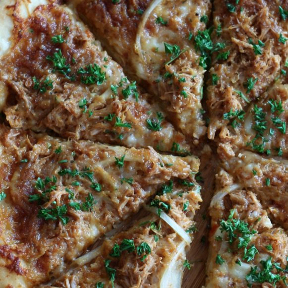 Pizza artesanal,queso mozarella ,atún,cebolla blanca y chimichurri de la casa