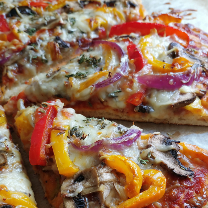 Queso mozarella,champiñones ,pimientos asados ,cebolla y calabaza
