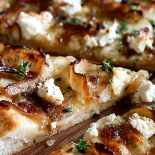 Pizza artesanal,manzana caramelizada,queso de cabra y un toque de miel