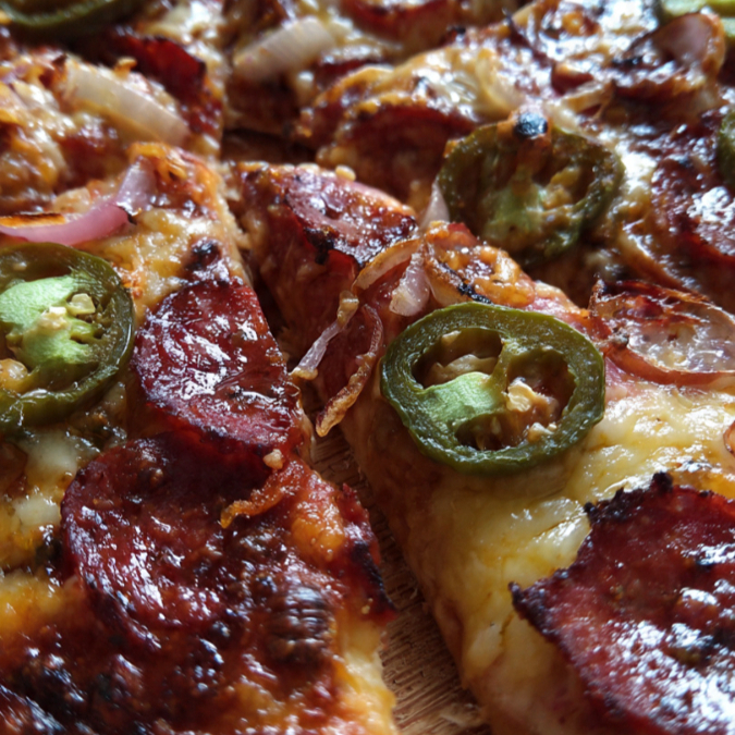 Pizza artesanal ,con salsa de la casa ,queso mozarella,chorizo español,cebolla,chile jalapeños,pierna ahumada.