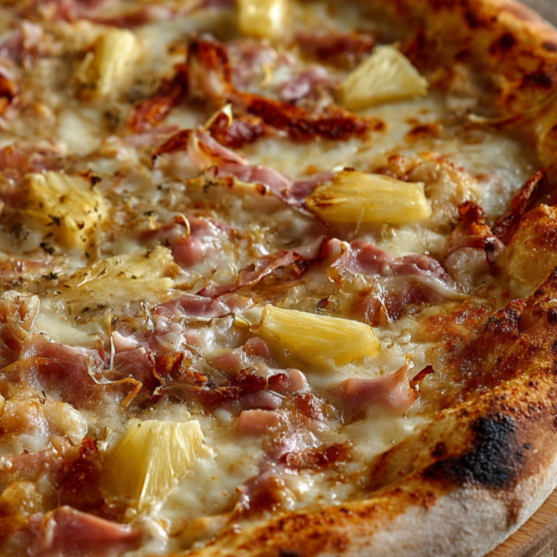 Pizza artesanal,jamón ,pierna ahumada y piña en almíbar.