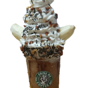 Frappe de platano con chocolate y nuez, DECORACION PUEDE VARIAR DEBIDO AL DOMO Y EMPLAYE QUE SE USA PARA EL TRASLADO