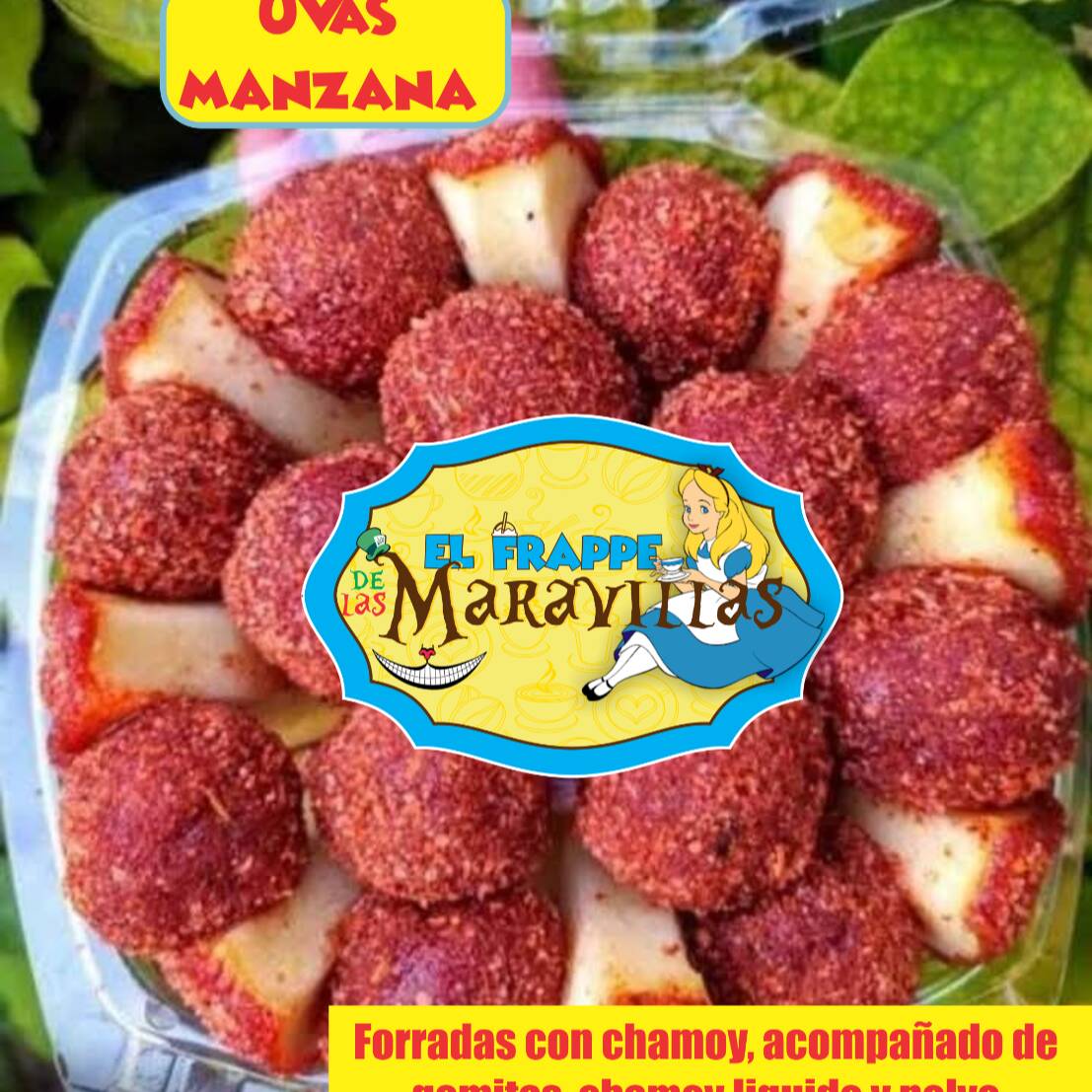 manzana forrada con pulpa de chamoy, cacahuates, 1 tipos de gomitas, salsa de chamoy y miguelito