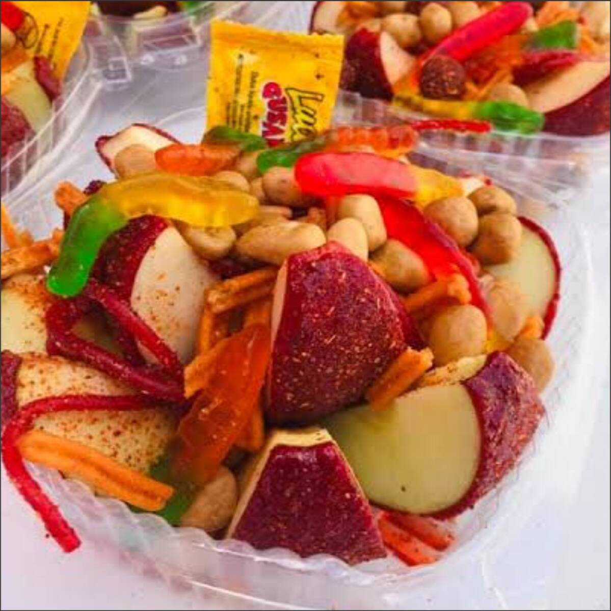 Mix de manzana loka con uvas lokas acompañado de gomitas y chamoy.
