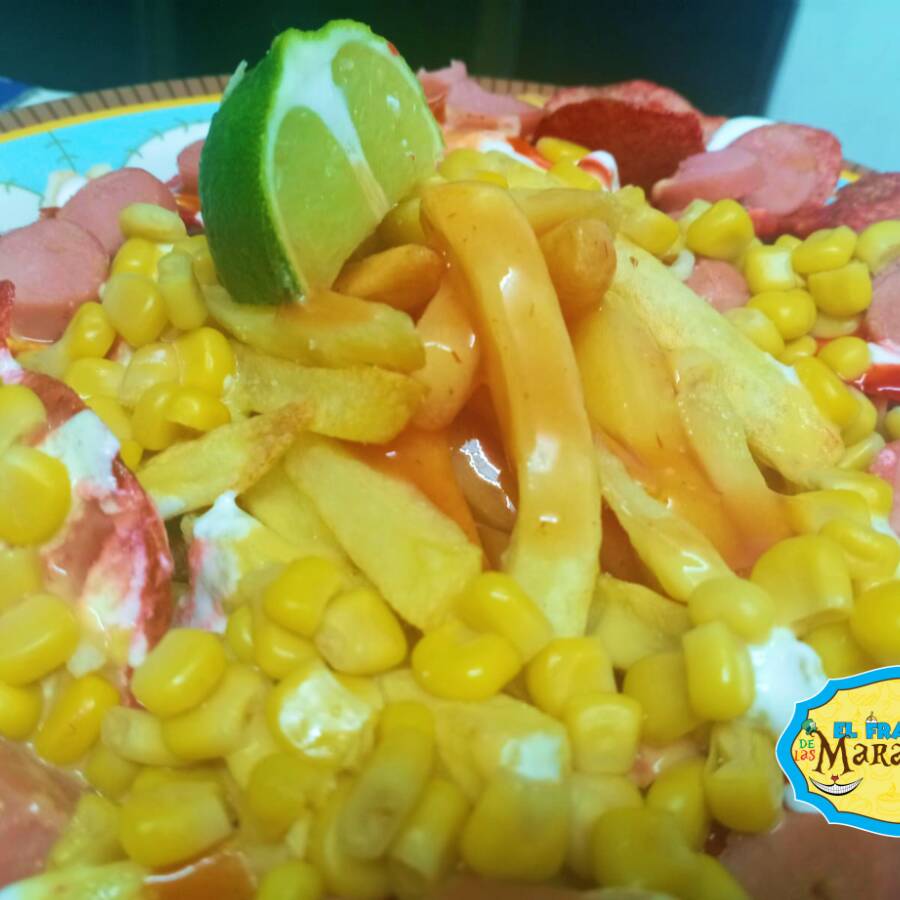 Preparado con 2 sabritas y paquetaxo, con papas a la francesa, salchicha, salsa picante, mediacrema, limon, salsa de chamoy y granitos de elote