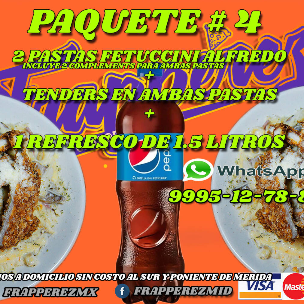 Dos pastas alfredo o chipotle mas ordenes de tenders para tus pastas + refresco de 1.5 litros (añade 2 complementos a las 2 pastas)