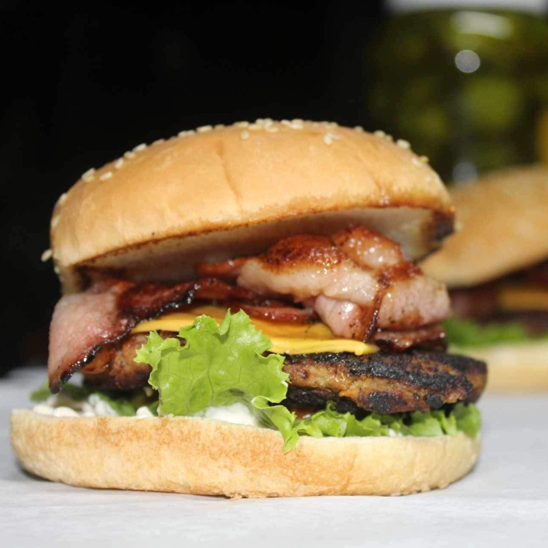 150 gramos de carne de res + tocino, cebolla, tomate, lechuga, queso gratinado + papas a la francesa