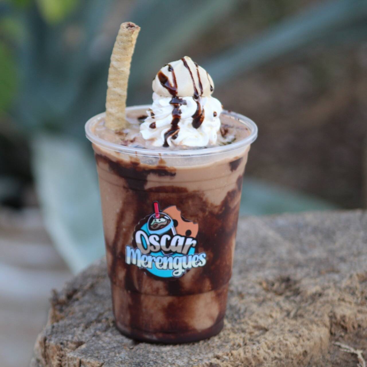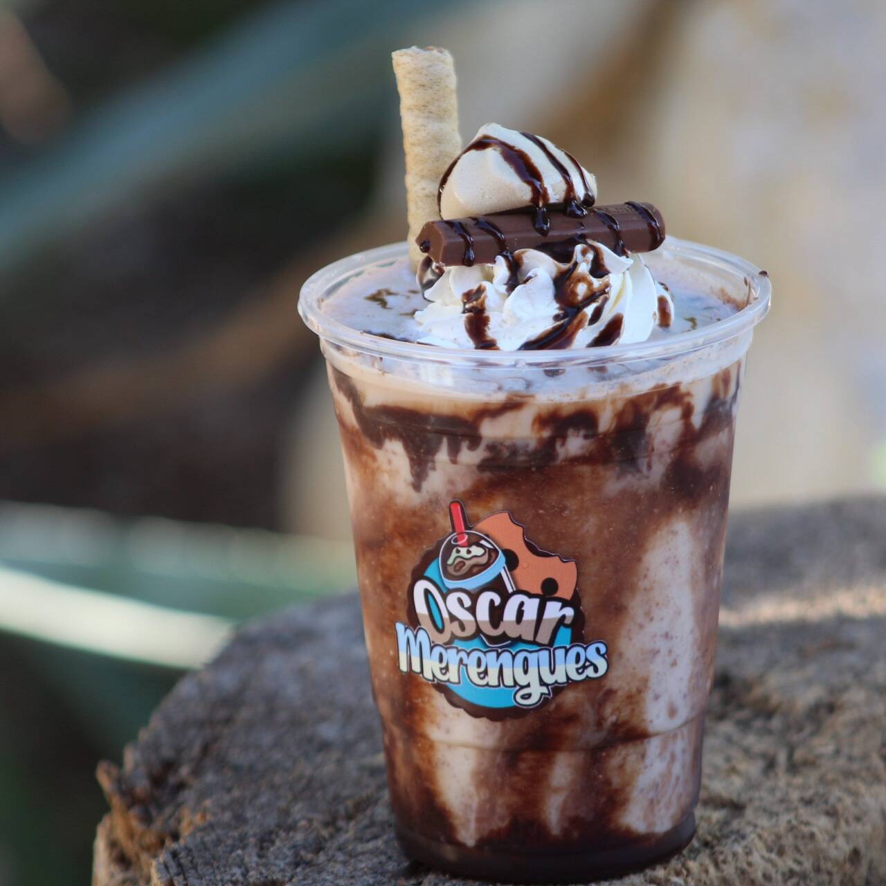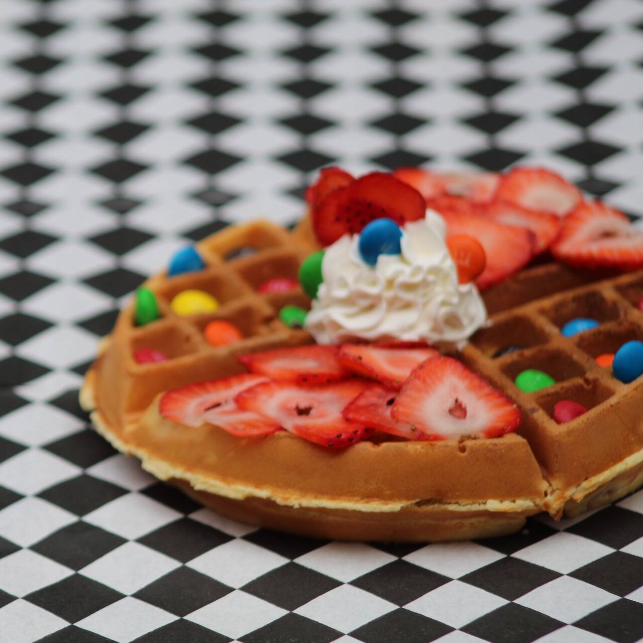 waffle con trozos de fresa, m&m´s y herseys de decoracion