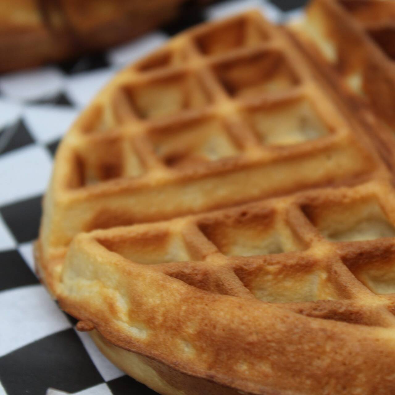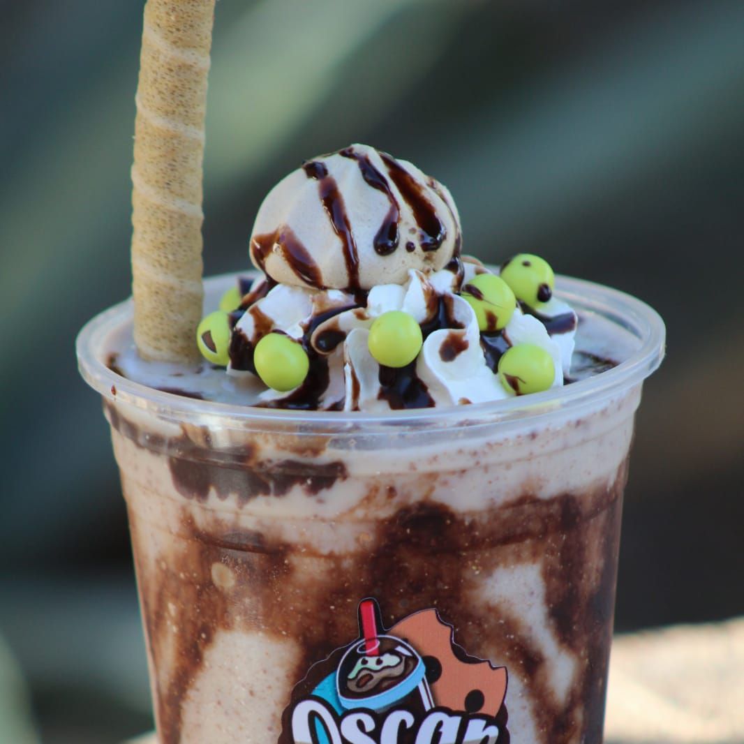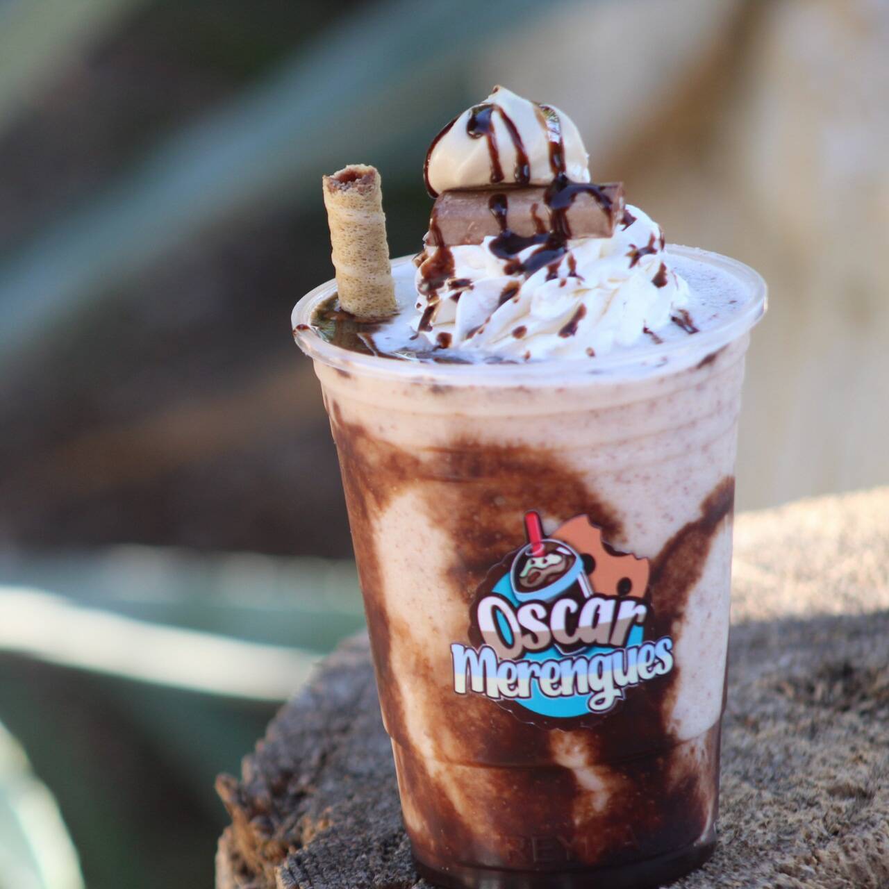 waffle con trozos de fresa, m&m´s y herseys de decoracion