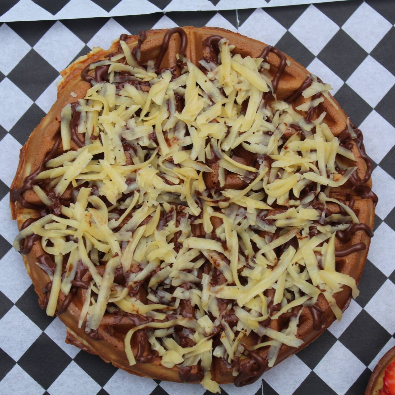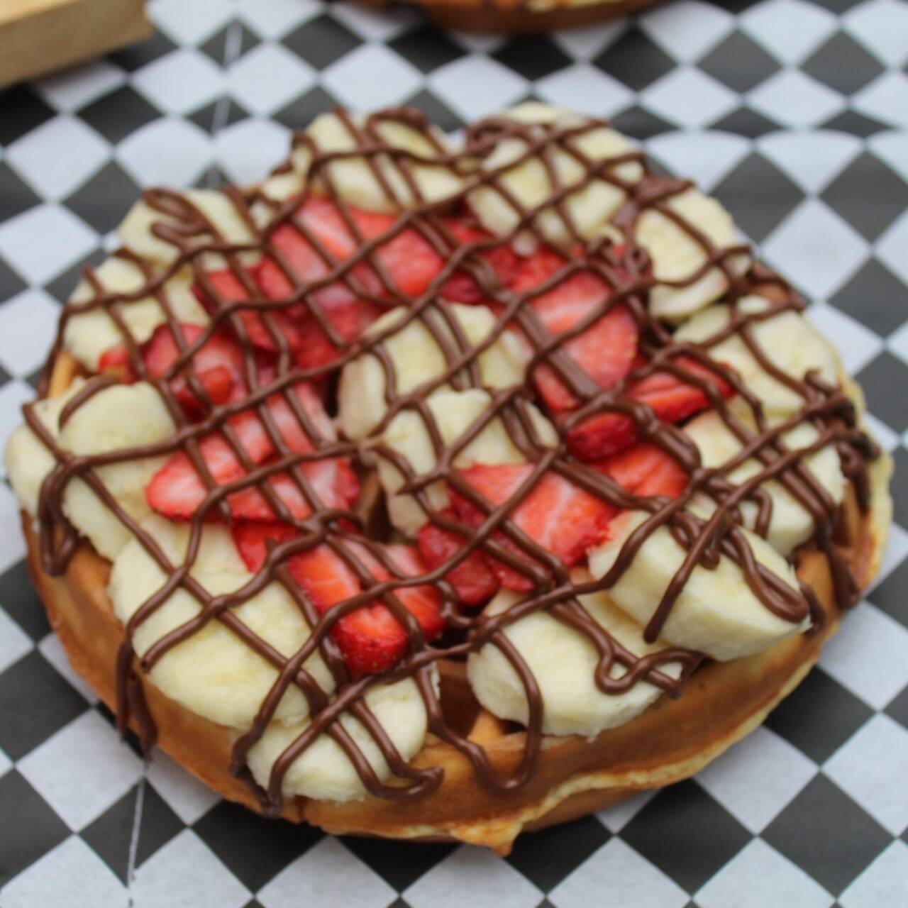 waffle con rebanadas de fresa y platano, con nutella en el centro