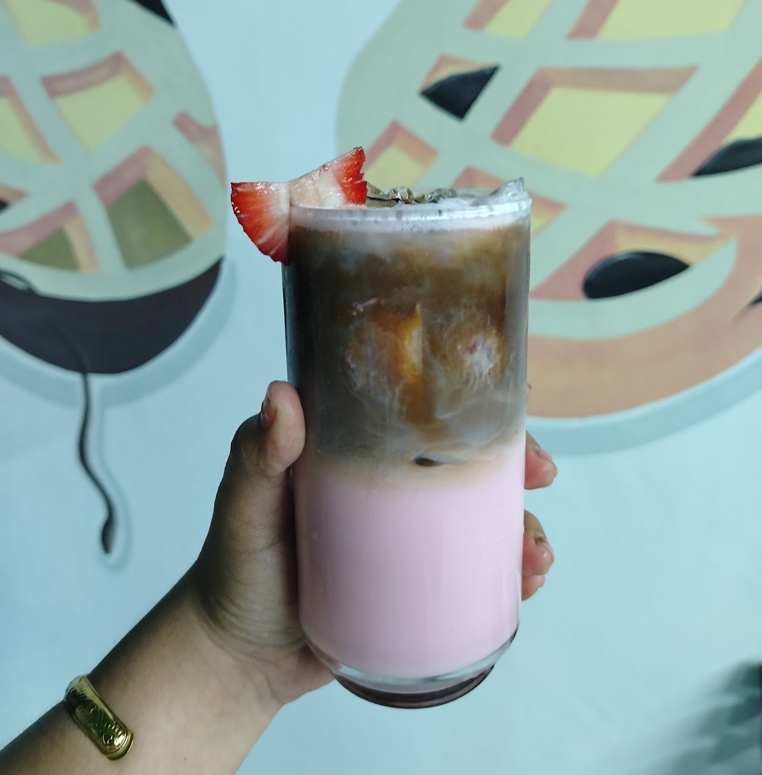Base café, leche de fresa, fresas naturales troceadas.