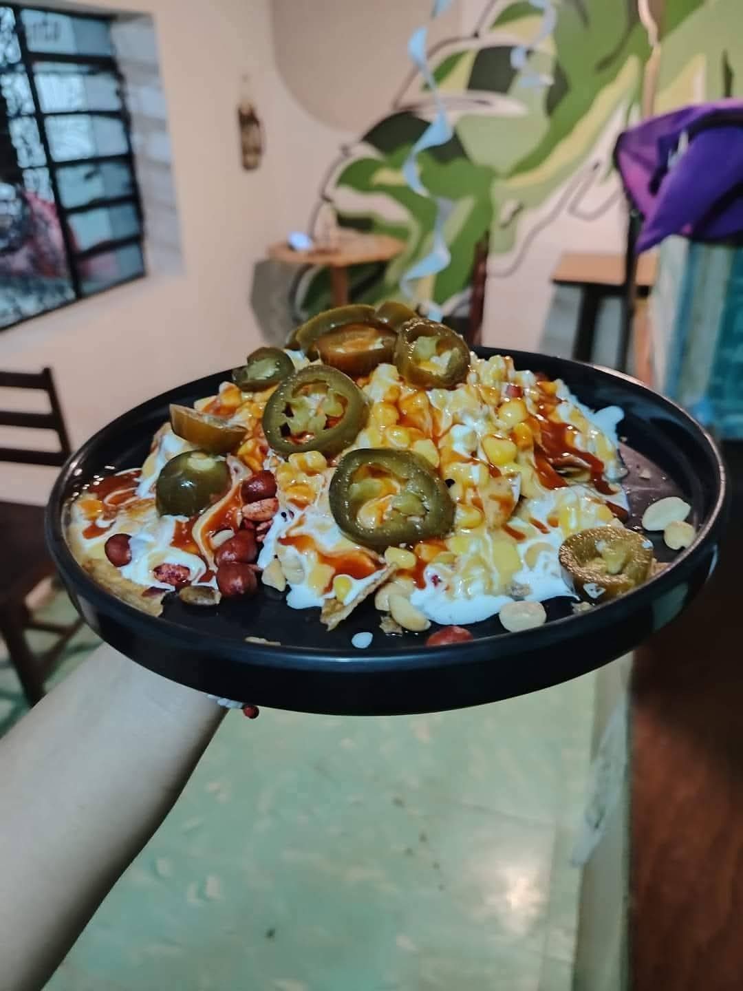 Tostitos, media crema, cacahuates, queso sopero, chile, jalapeño.