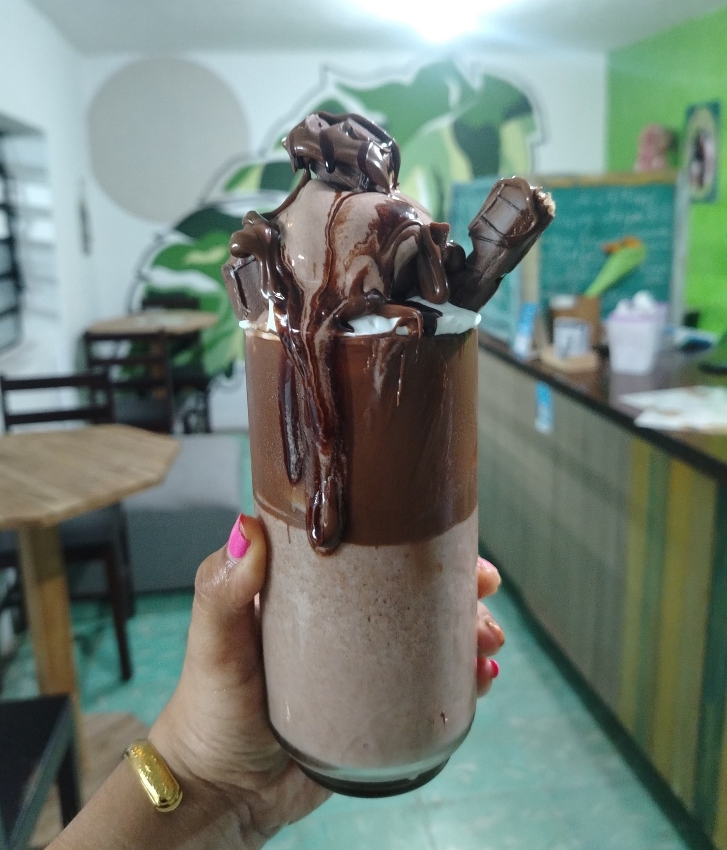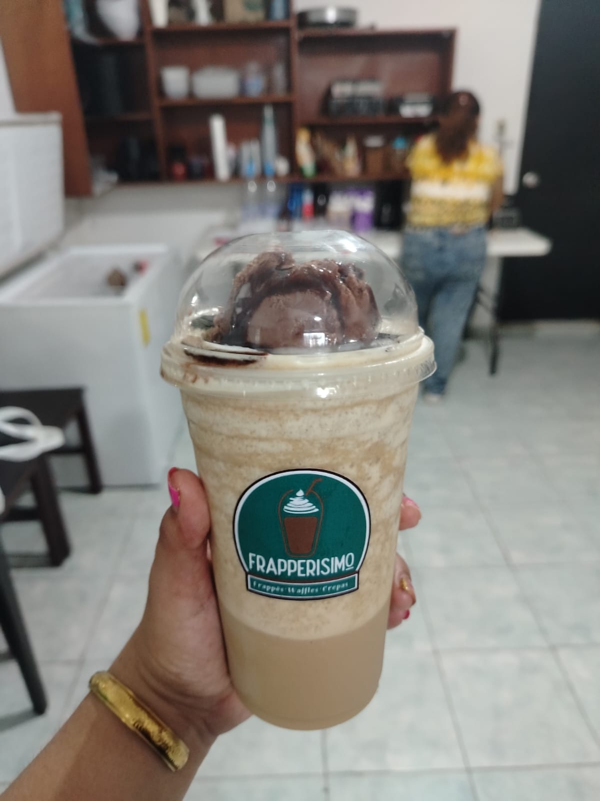 Frapé sabor Ferrero Rocher, bañado en crema de avellana, más chispas de chocolate y helado de chocolate.