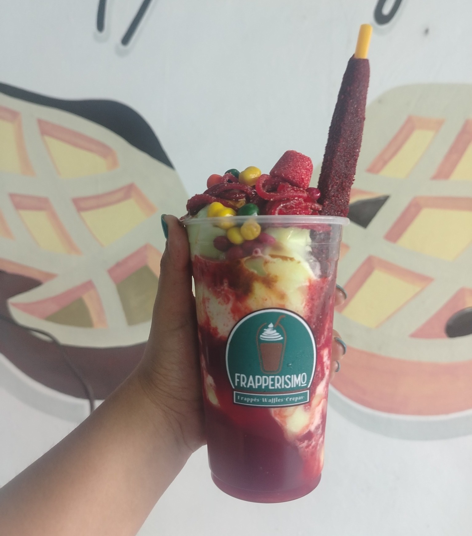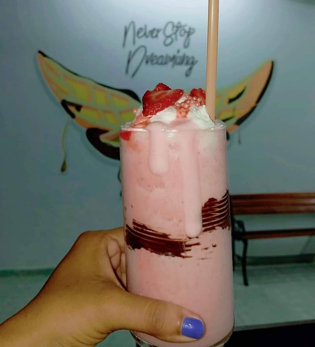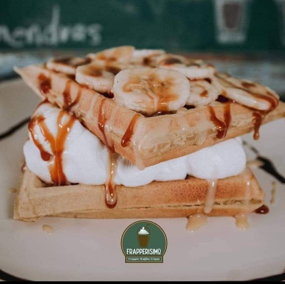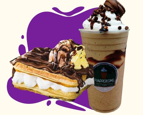 1 waffle 2 piezas rellenos de crema batida + 2ingredientes + 1 frappe a elección (oreo,mocca, capuchino, mamut)
