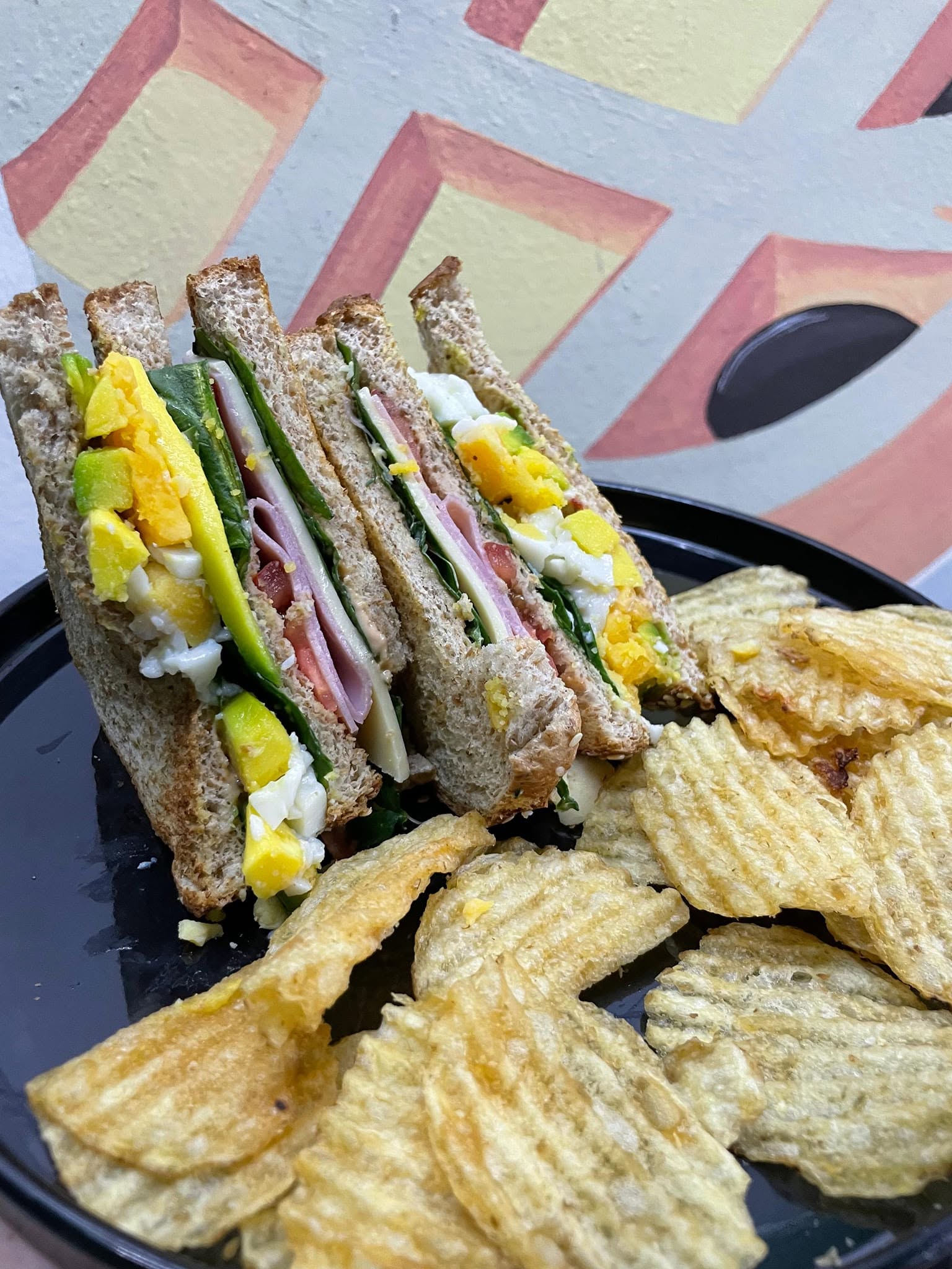 Elaborado con jamón de pavo, queso manchego, espinacas, huevo, tocino, tomate, aguacate, salsa de chipotle y papas.