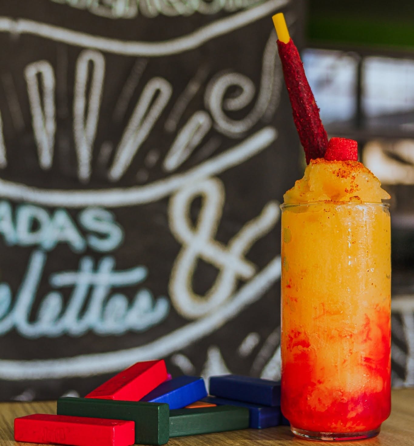Vibrante smoothie de agua con un toque ácido y dulce de chile se acompañan con Miguelito y chamoy, base agua.