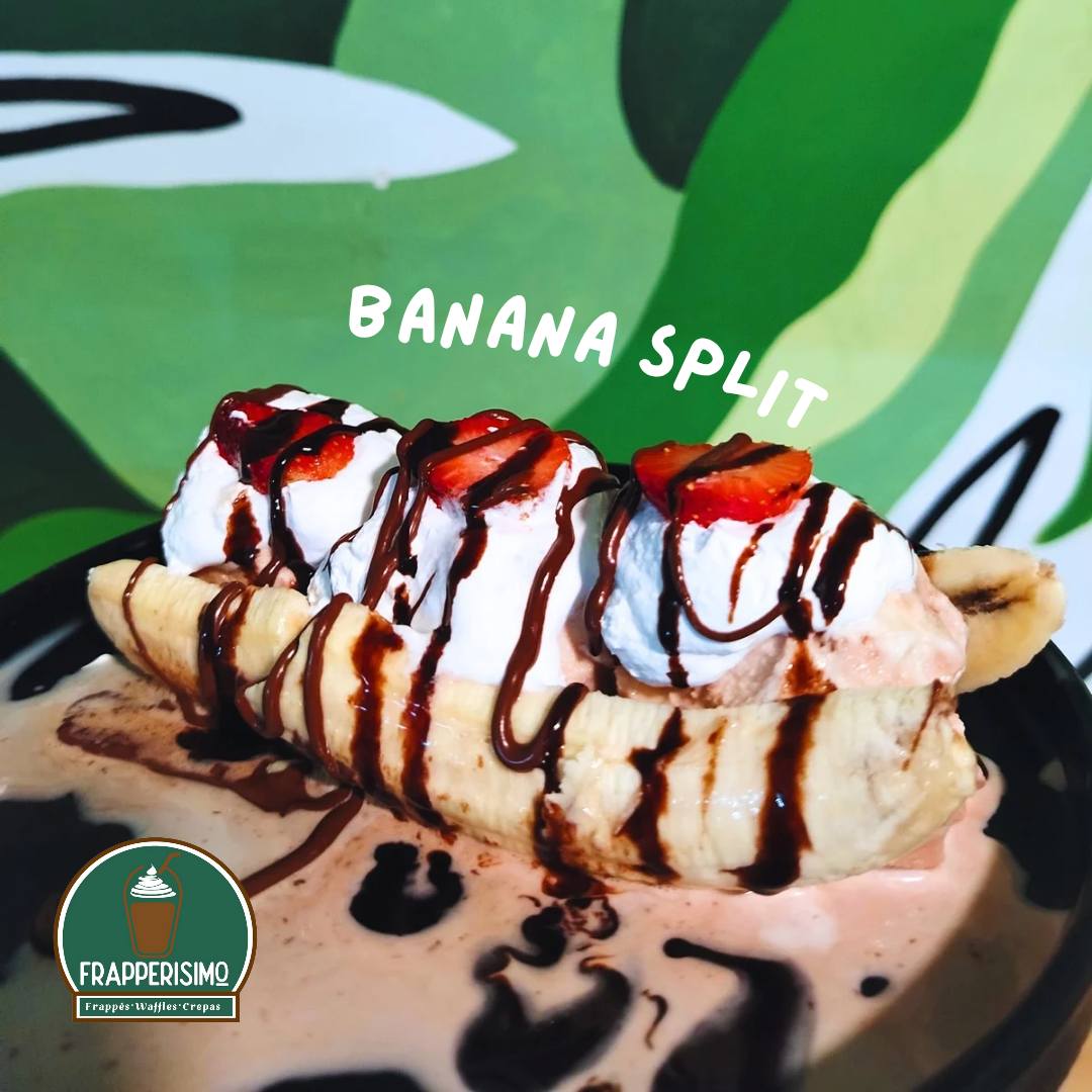 Plátano, con 3 bolas de helado, fresas, Nutella, chispas de chocolate, sirope de chocolate, crema batida, elige 1 topping.