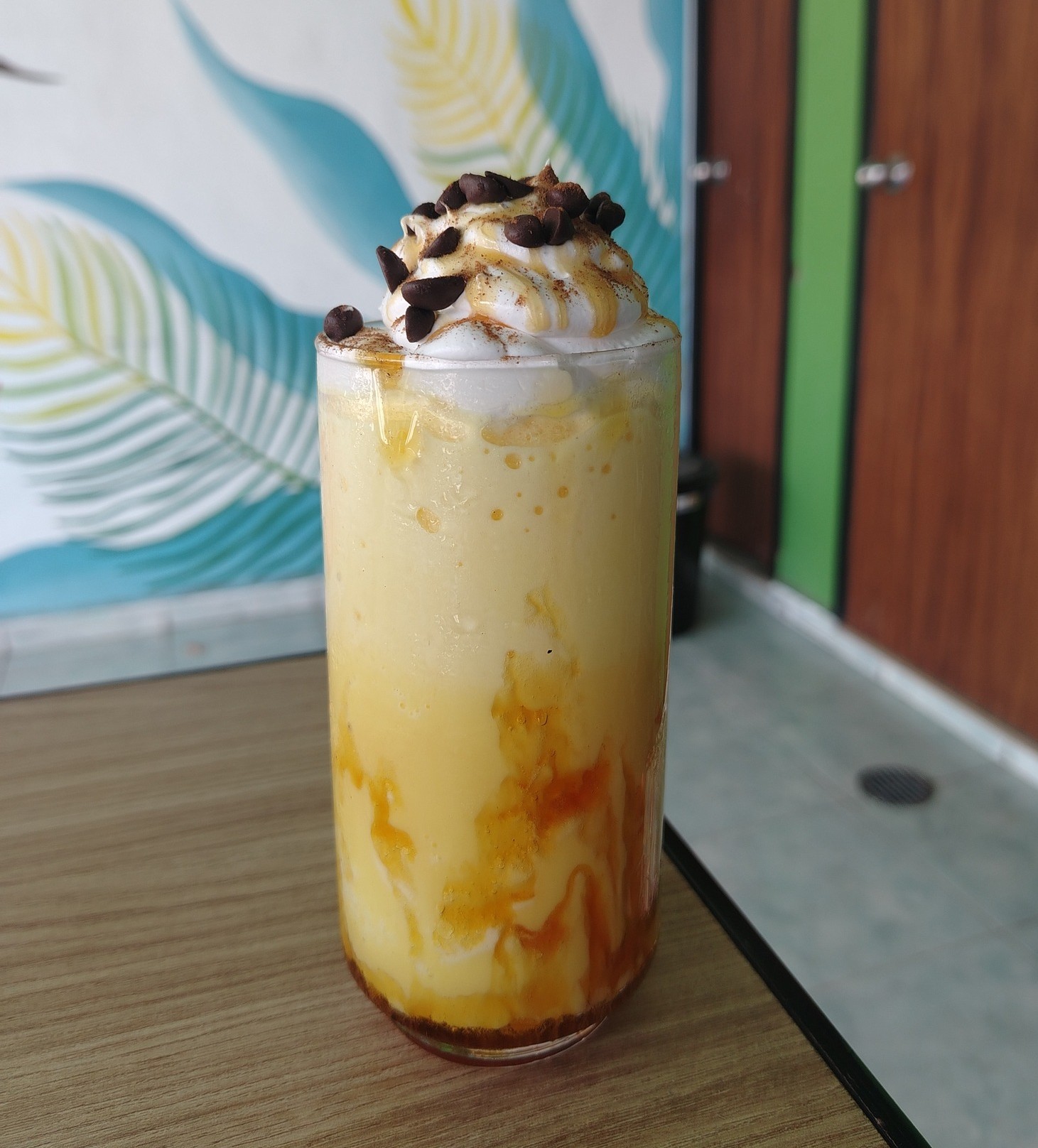 Frappé base de flan, caramelo, chispas de chocolate y helado de vainilla.