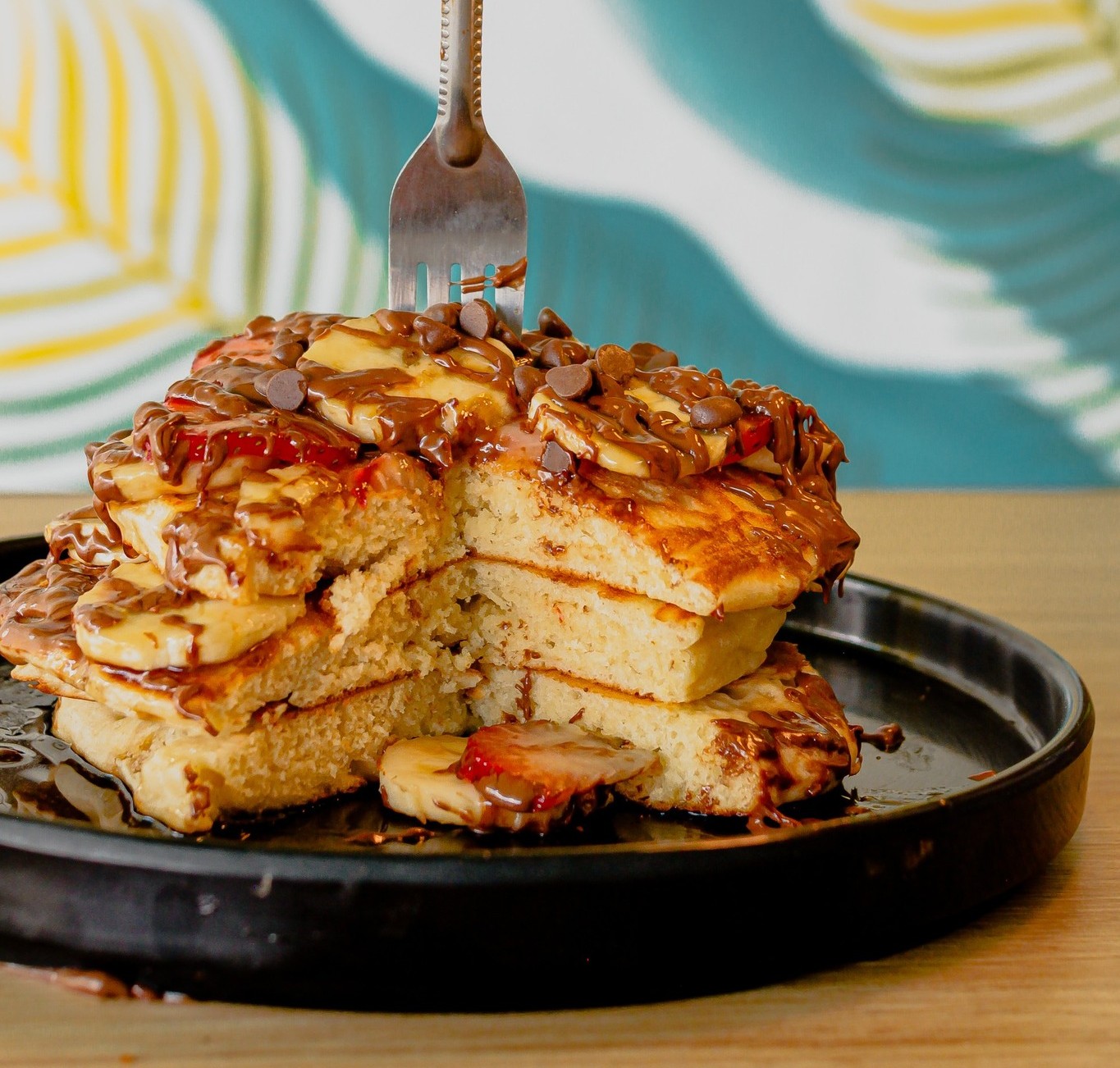 3 piezas con Nutella, plátano, fresas, maple, chispas.