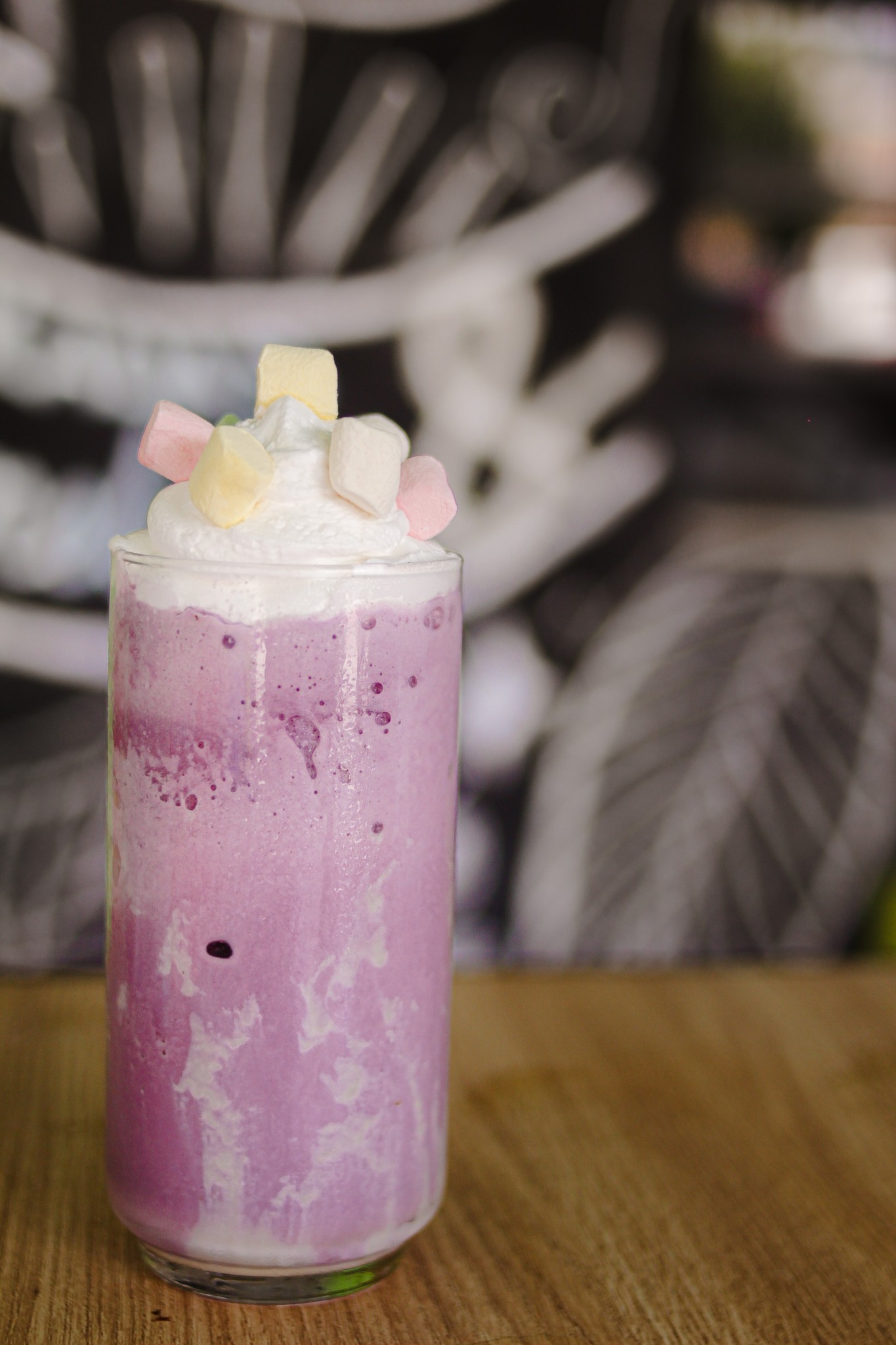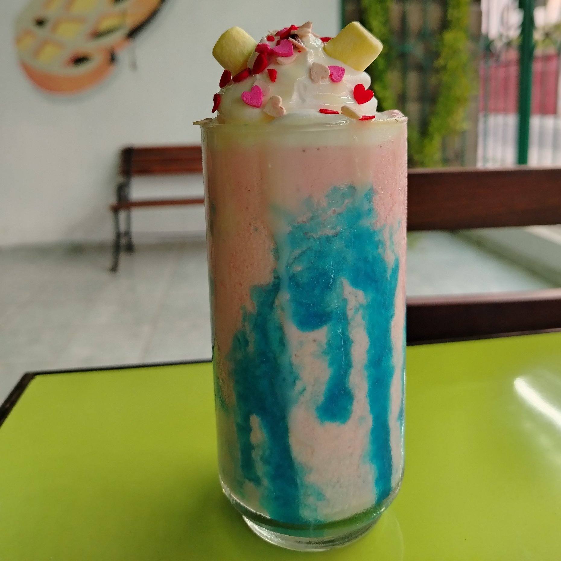 Frapé a base de malvavisco, fresa, con magia de unicornio y helado de vainilla.