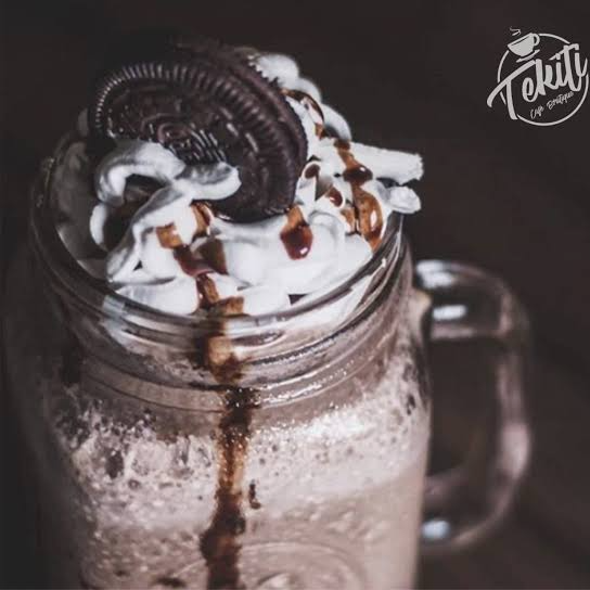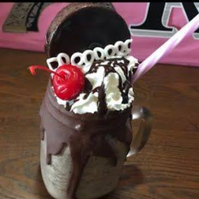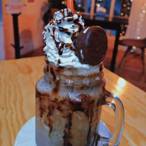 Bebida instantánea preparada con hielo, leche, galleta Oreo, con una cubierta de crema batida, chocolate líquido, chispas, sunchos, barquilla de chocolate y un extra de galleta Oreo encima.