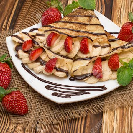 Deliciosa crepa acompañada de 1 ingrediente: Lechera, mermelada de fresa,cajeta, miel mapple o nutella.