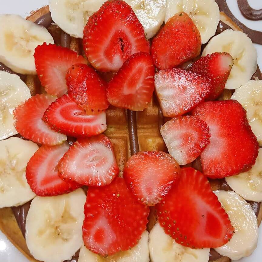 Delicioso waffle con platano y fresa con un ingrediente a elegir: Nutella, Cajeta, Lechera o Chocolate