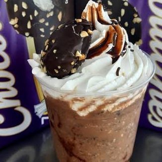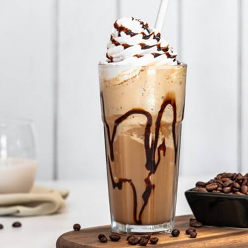 Bebida instantánea preparada con hielo, leche y café, encima crema batida, chocolate líquido, chispas y su barquilla de chocolate.