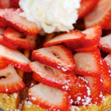Delicioso Waffle con fresa, lechera y crema batida