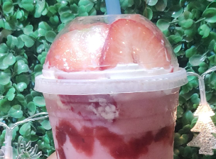 Disfruta de un machacado de 100% fresa natural y leche entera coronado con lechera y canela