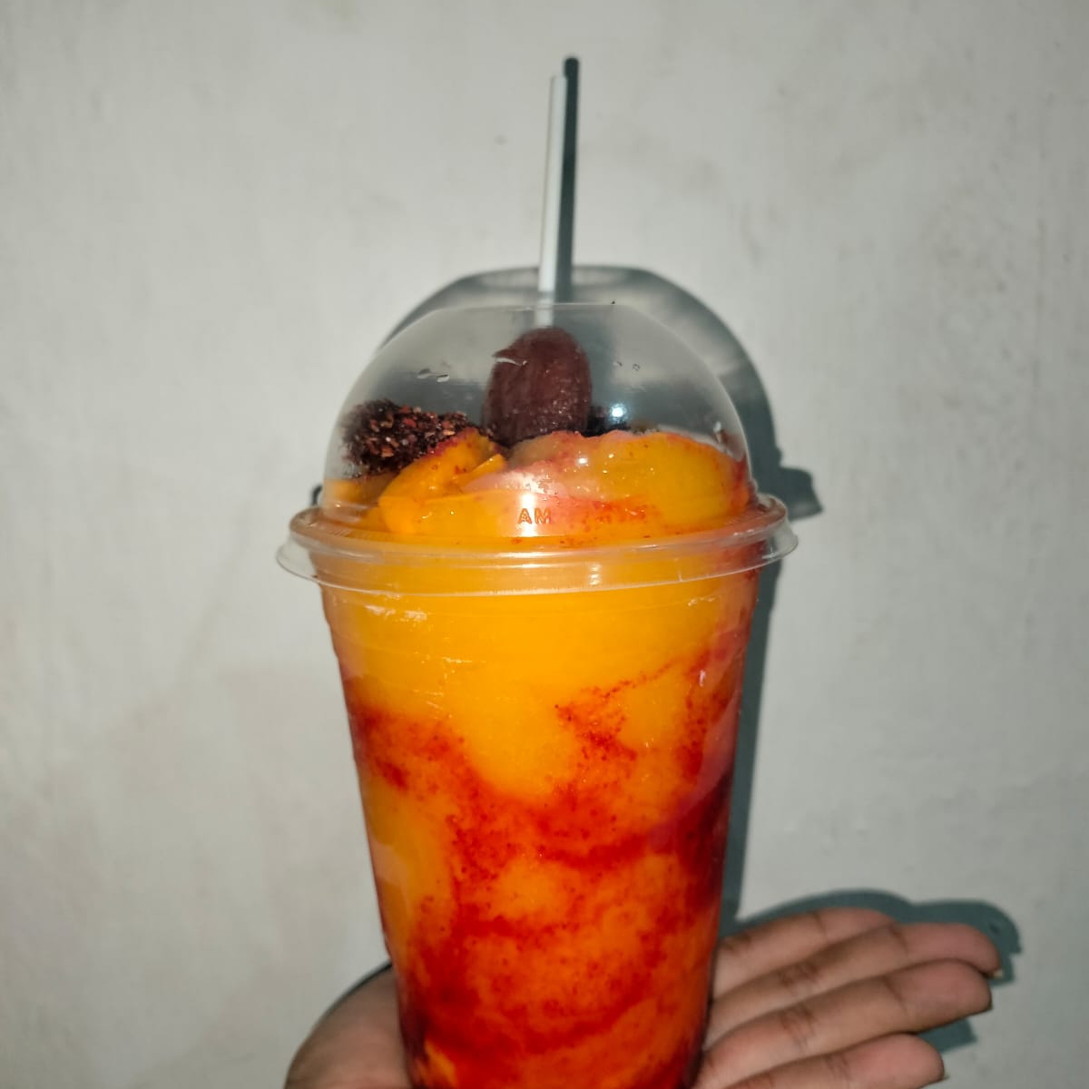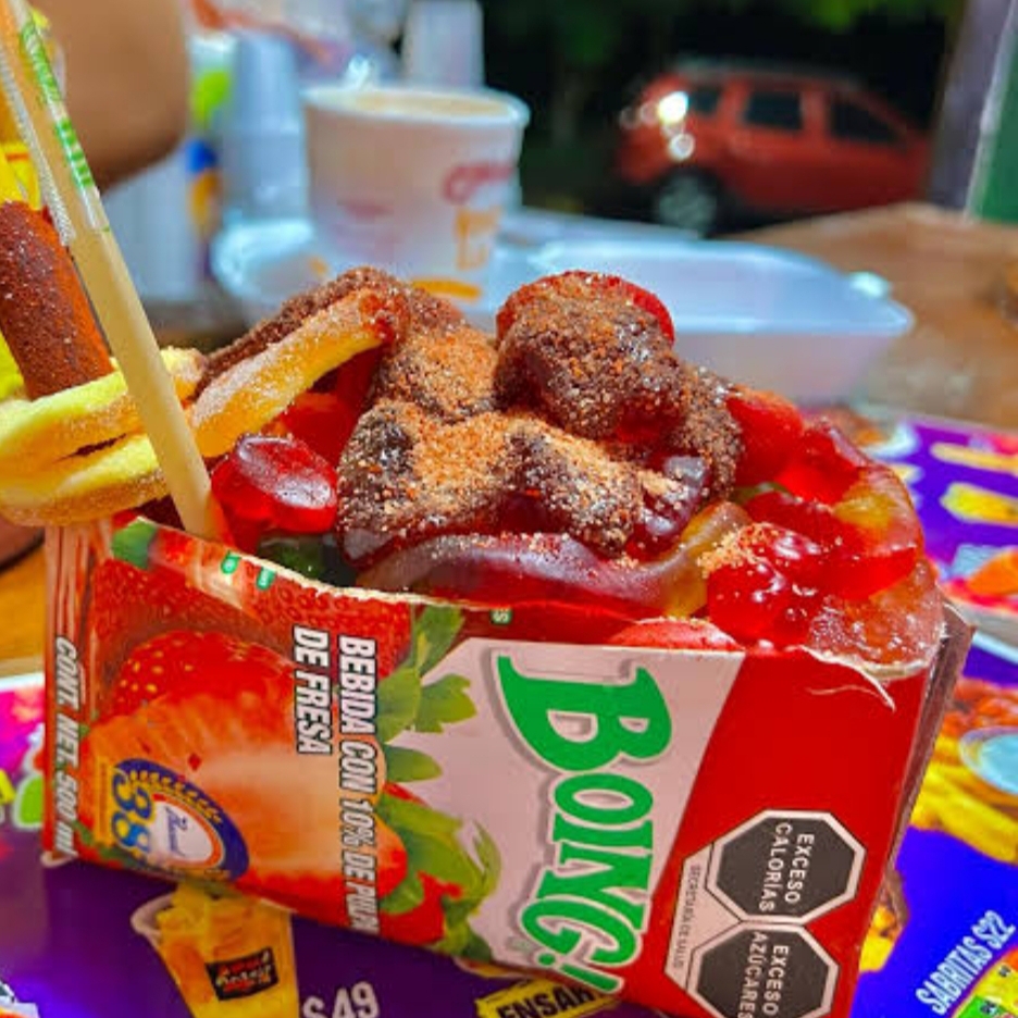 smothie a base de jugo y fruta natural, decorado con chamoy, gomitas y banderilla de chamoy
