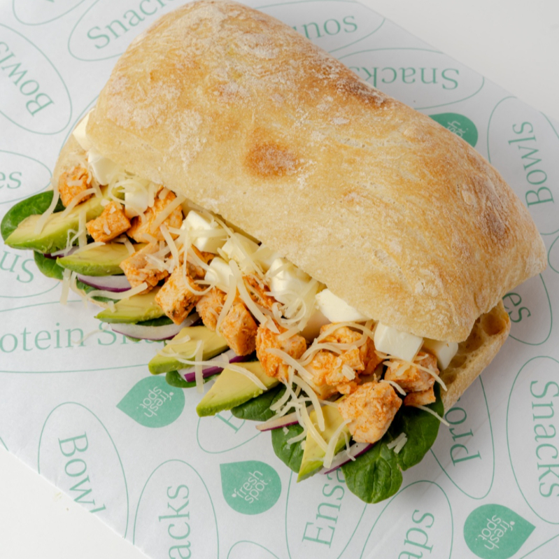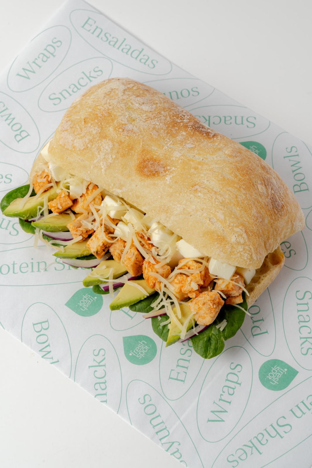 Complementos: aguacate, cebolla morada, espinaca, proteína: pollo búfalo, lácteo: queso parmesano, aderezo: cesar.