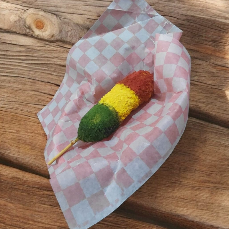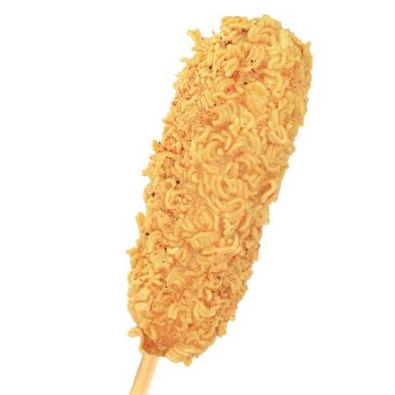 Una banderilla cubierta con fideos ramen, para una textura única y divertida , relleno de la deliciosa textura del queso derretido.