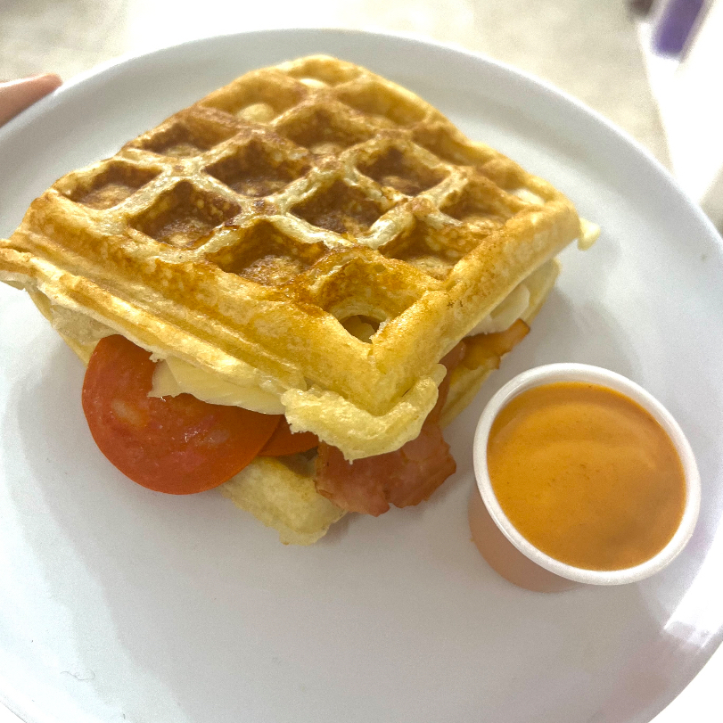 Sándwich de waffle con tocino y queso manchego ,con aderezo chipotle de complemento