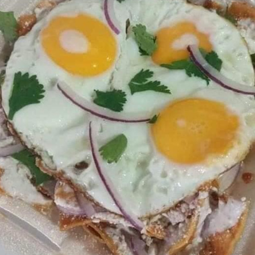 Deliciosos Chilaquiles Rojos con salsa Picosita, servidos con fajita de pollo, 3 huevitos estrellados, media crema y Queso Sopero. Coronado con Cebolla morada y Cilantro fresco.