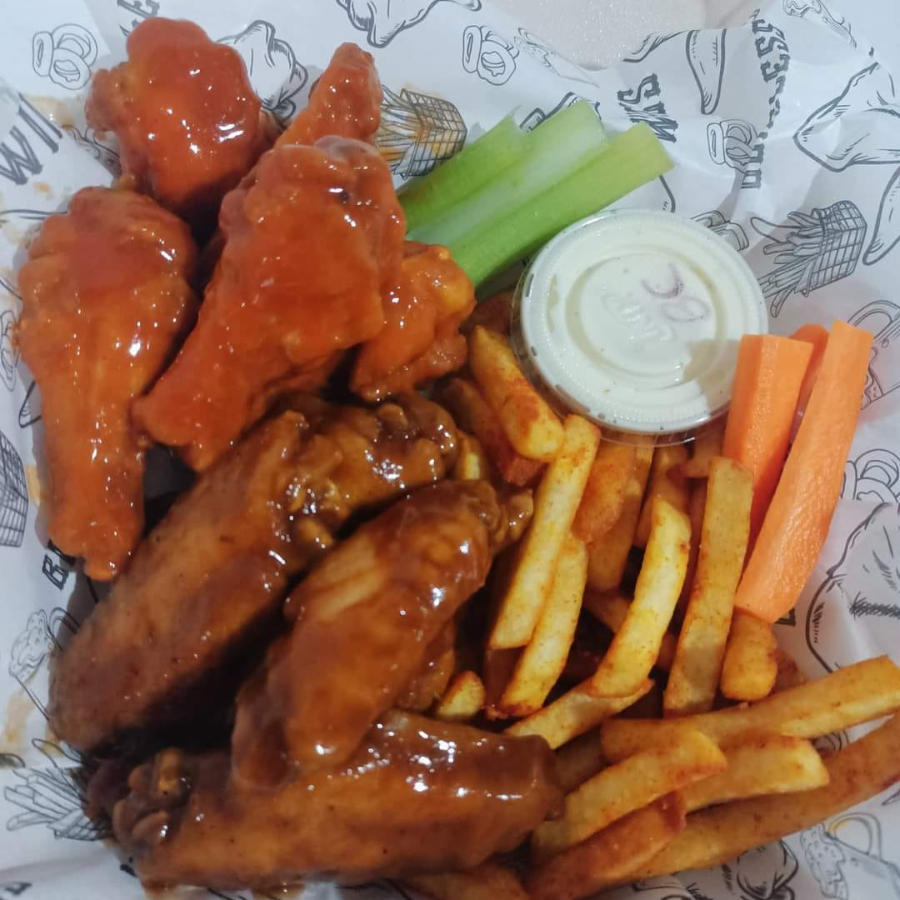 10 Deliciosas Alitas frescas del día y Fritas a la Perfección. Acompañados de Aderezo Bluecheese premium, apios, zanahorias y papas a la francesa ¿. Puede Elegir de 1 a 2 sabores: BBQ, Bufalo, Tamarindo, Flaming Hot, Mango Habanero, piña Habanero, Bufalo Extra Picante, Ajo con Queso de Bola, Lemon Peper o Cajun. Puede solicitarlo como comentario.