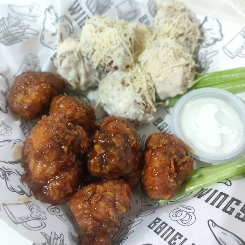 12 Deliciosos Boneles, hechos de Pechuga fresca del dia y Fritos a la Perfeccion. Acompañados de Salsa Ranch, apios y Zanahoria. Puede Elegir de 1 a 2 sabores: BBQ, Bufalo, Tamarindo, Flaming Hot, Mango Habanero, piña Habanero, Bufalo Extra Picante, Ajo con Queso de Bola, Lemon Peper o Cajun. Puede solicitar el sabor que desee en el comentario