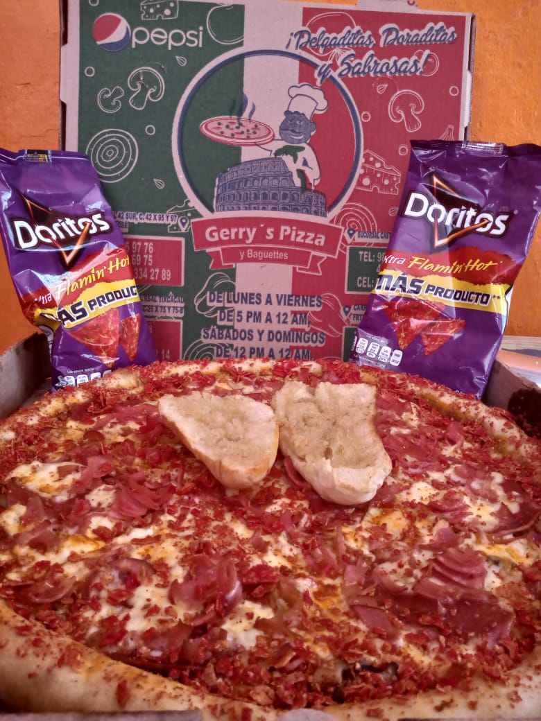 Salami, champiñón,tocino, doritos flamin hot+ orilla de queso philadelpia