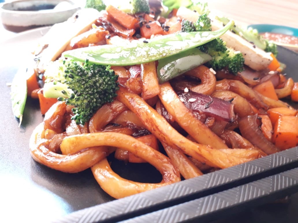 Fideo japones grueso con mezcla de vegetales, zanahoria, cebolla, pimiento verde, brócoli, carne de pollo, salteado con nuestra mezcla especial de soya, Aprox 600gr.