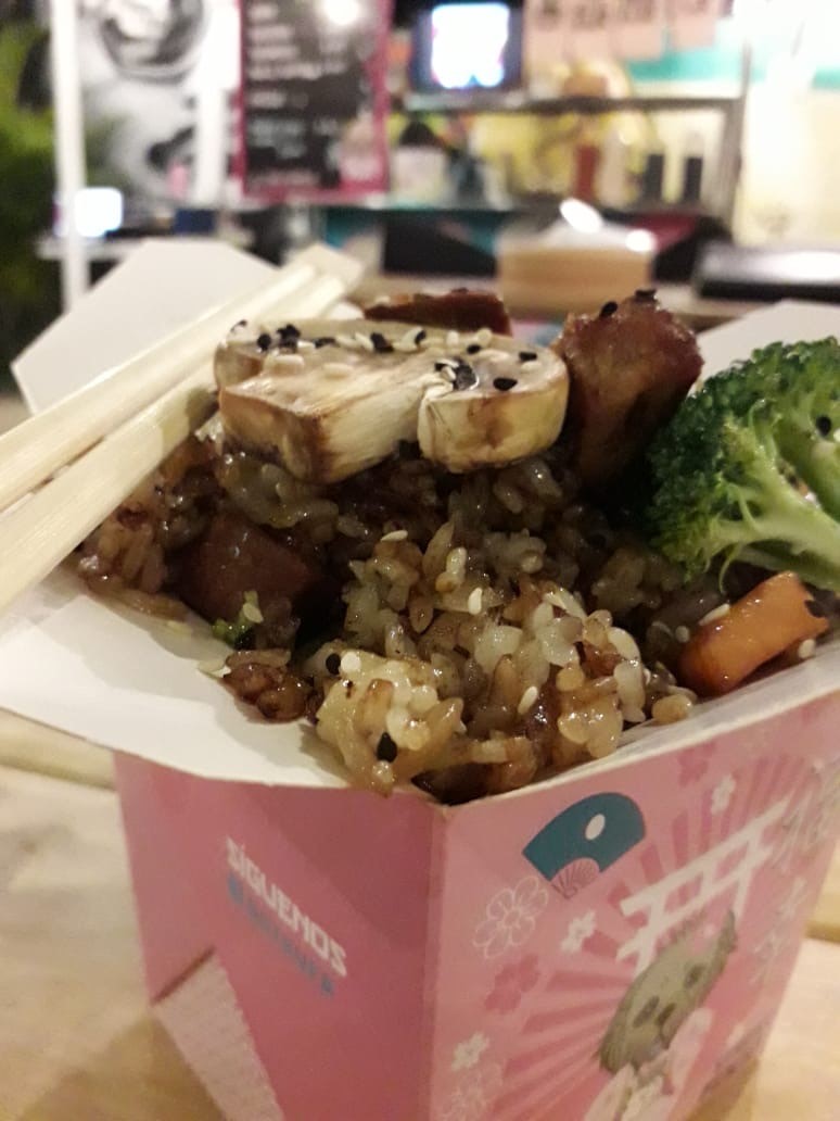 Arroz japonés con mezcla de vegetales, zanahoria, cebolla, pimiento verde, brócoli, carne de pollo salteado con nuestra mezcla especial de soya. Aprox 600gr.