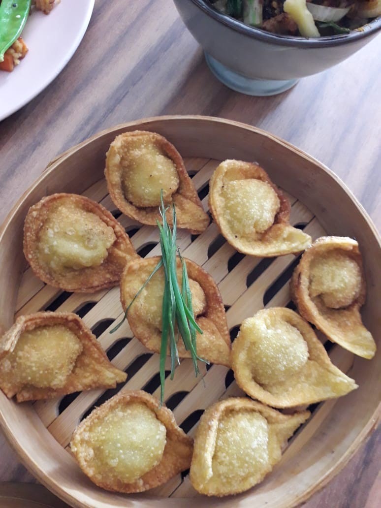 Orden de 9 crujientes empanaditas fritas para compartir, rellenas de carne con especias y nuestra salsa especial de soja