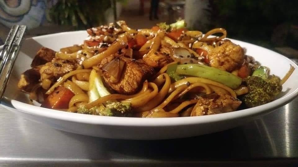 Tallarines con mezcla de vegetales, zanahoria, cebolla, pimiento verde, brócoli, carne de pollo salteado con nuestra mezcla especial de soya. Aprox 600gr.
