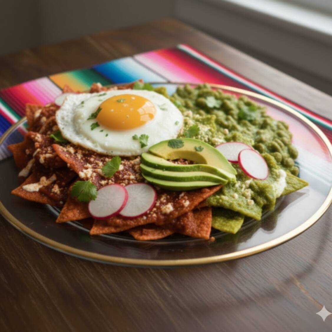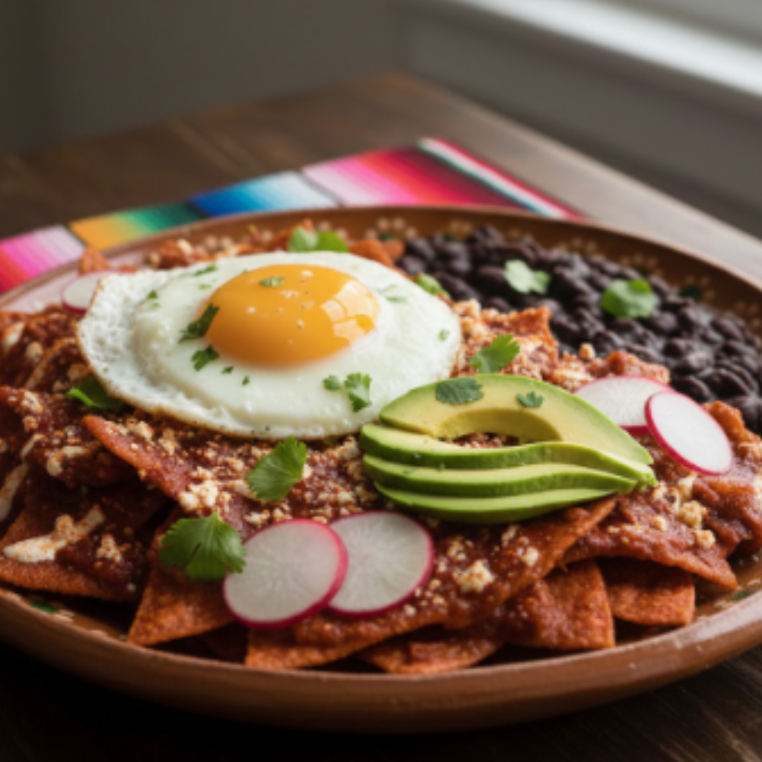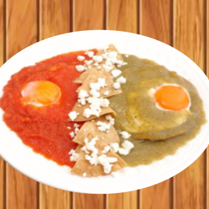 Orden de Totopos bañados en salsa roja y salsa verde, con pollo, media crema, cebolla, queso con un huevo frito, rábano, cilantro.