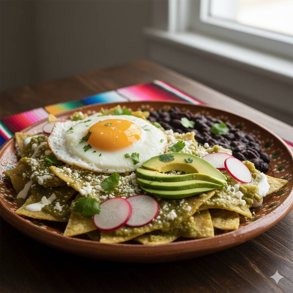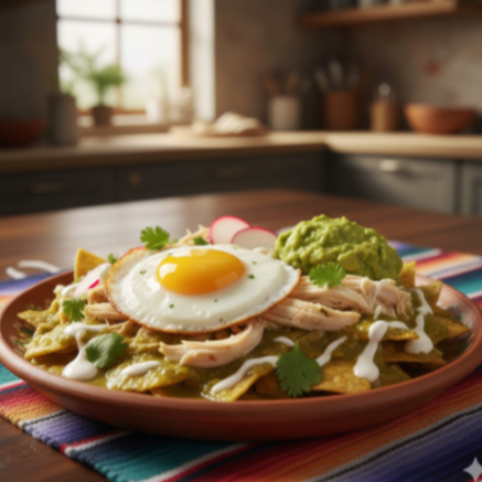 Orden de Totopos bañados en salsa verde, con pollo, media crema, cebolla, queso con un huevo frito, rábano, cilantro