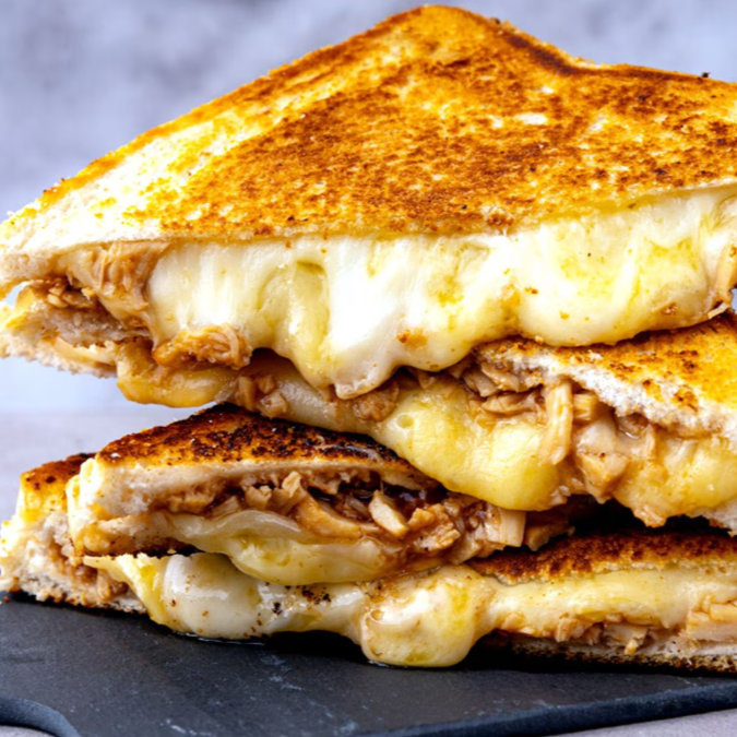 Pan blanco con mayonesa, jamón, queso, mayonesa, pollo asado y chile jalapeño