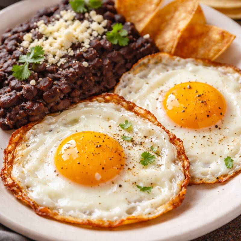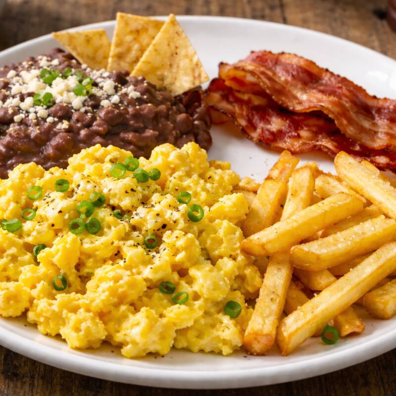 Orden de 2 huevos estrellados o revueltos cebolla y tomate acompañado de frijol refrito y papas fritas