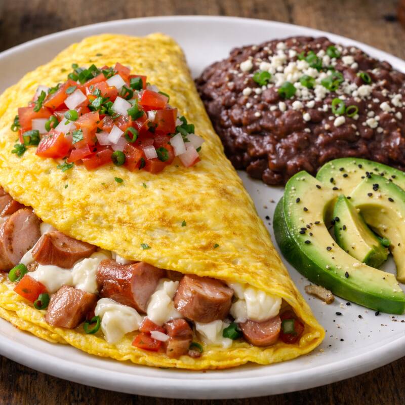 Orden de 2 huevos fritos rellenos de queso philadelphia y salchicha acompañado de frijol refrito, aguacate y salsas