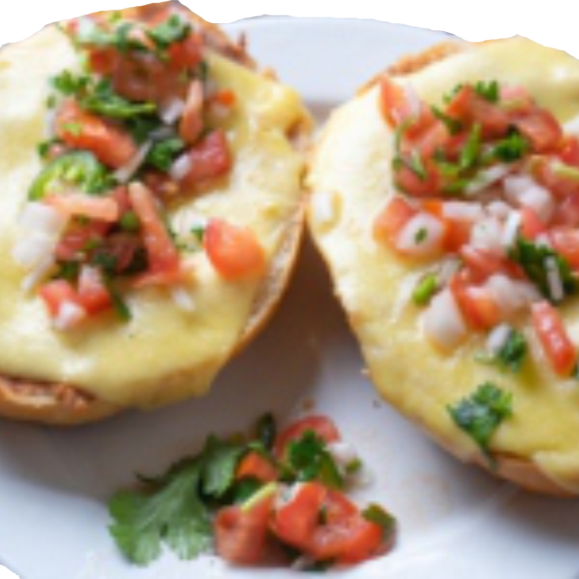 Par de panes horneados con frijol, aderezos, jamón, queso y pico de gallo