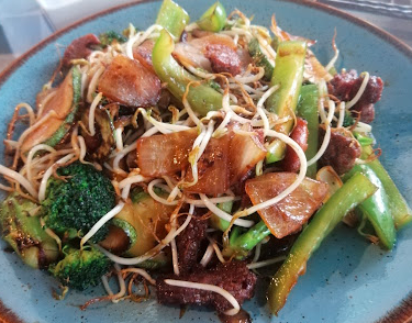 Salteado de verduras y carnes cahmpiñones, pimiento verde, calabaza italiana, brócoli, cebolla blanca, germen de soya, pollo, camarón y arrachera.